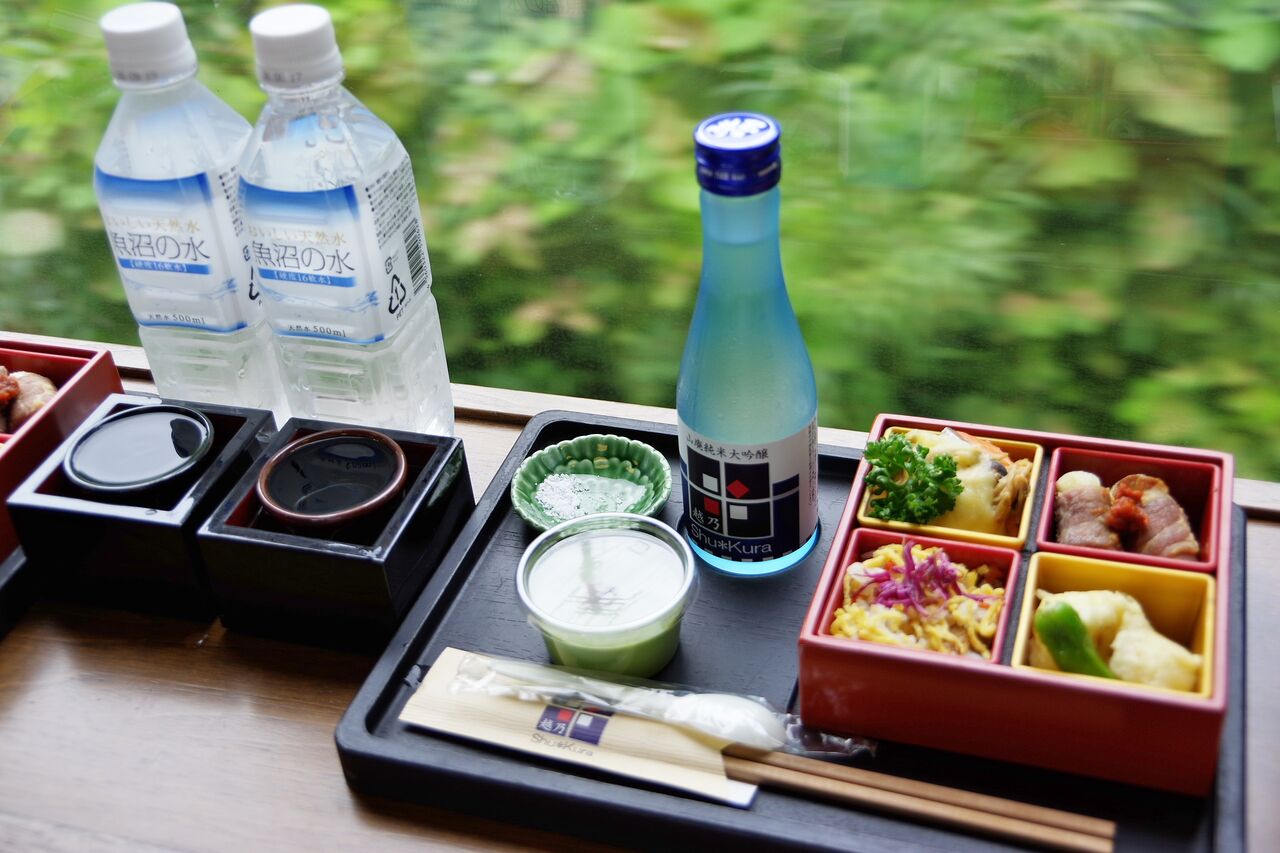 この1号車の座席は旅行商品として販売されており、日本酒とお食事、乗車券がセットで売られている。お値段は乗車区間や時期にもよるが、おおよそ1万円に届かないくらい。これが高いのか安いのかは乗って確かめるべし。