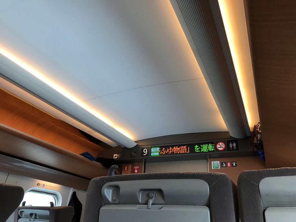 座席から天井部を眺める。実に落ち着きある車内でゆとりを感じる。荷物棚の車端部にはブランケットが置いてあり、乗車中は利用できる。貸出なので持ち帰りはできない。