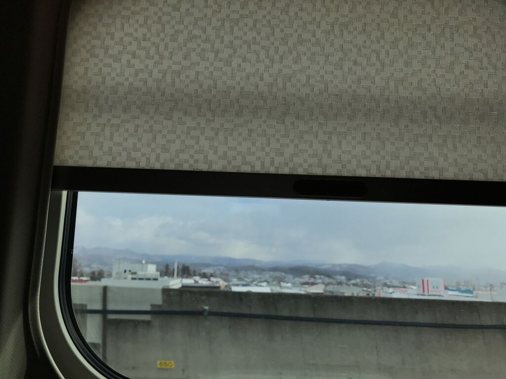 ブラインドは幾何学模様となっている。JR北海道所有のH5系では雪の結晶のデザインになっているようだ。