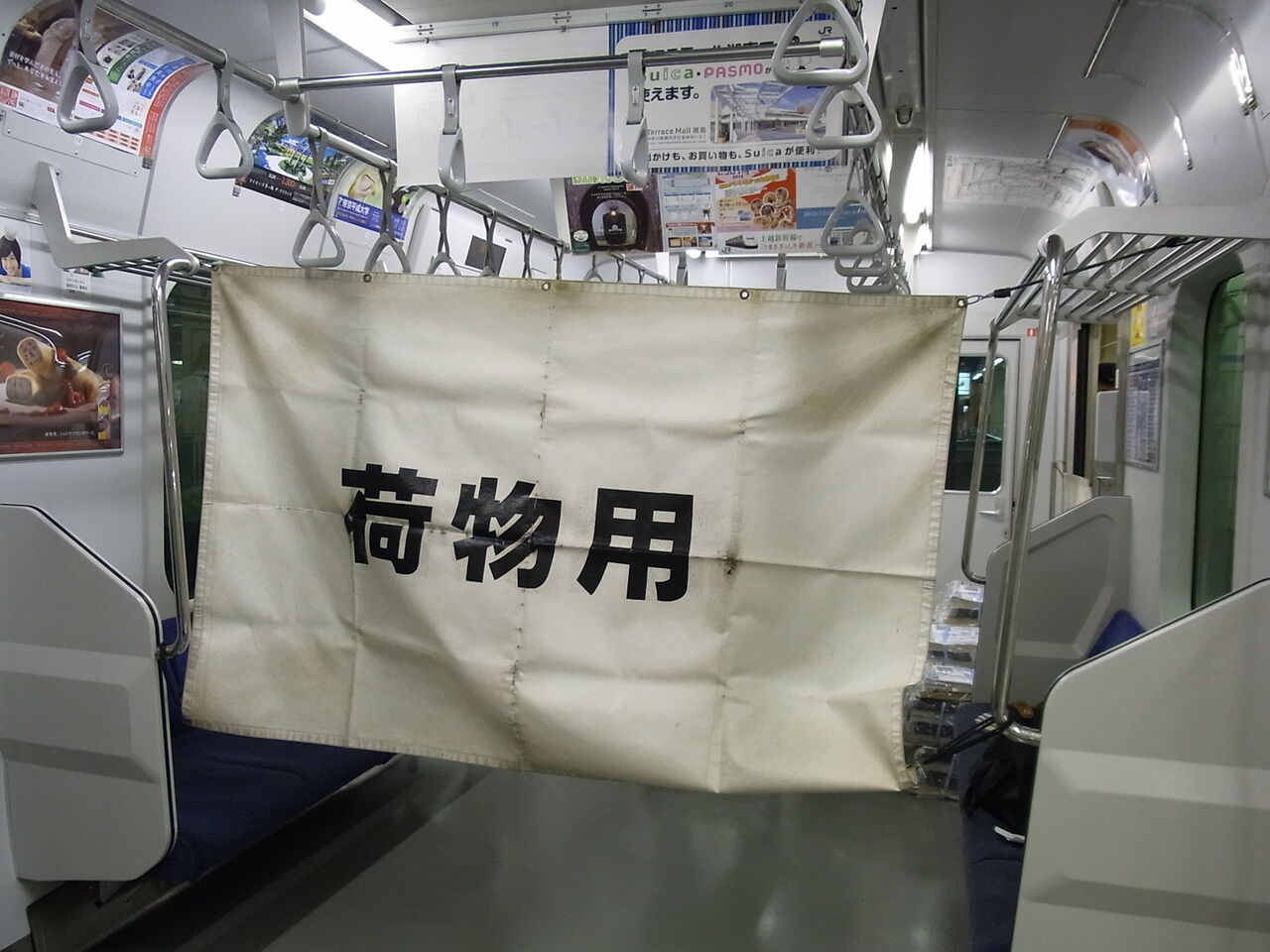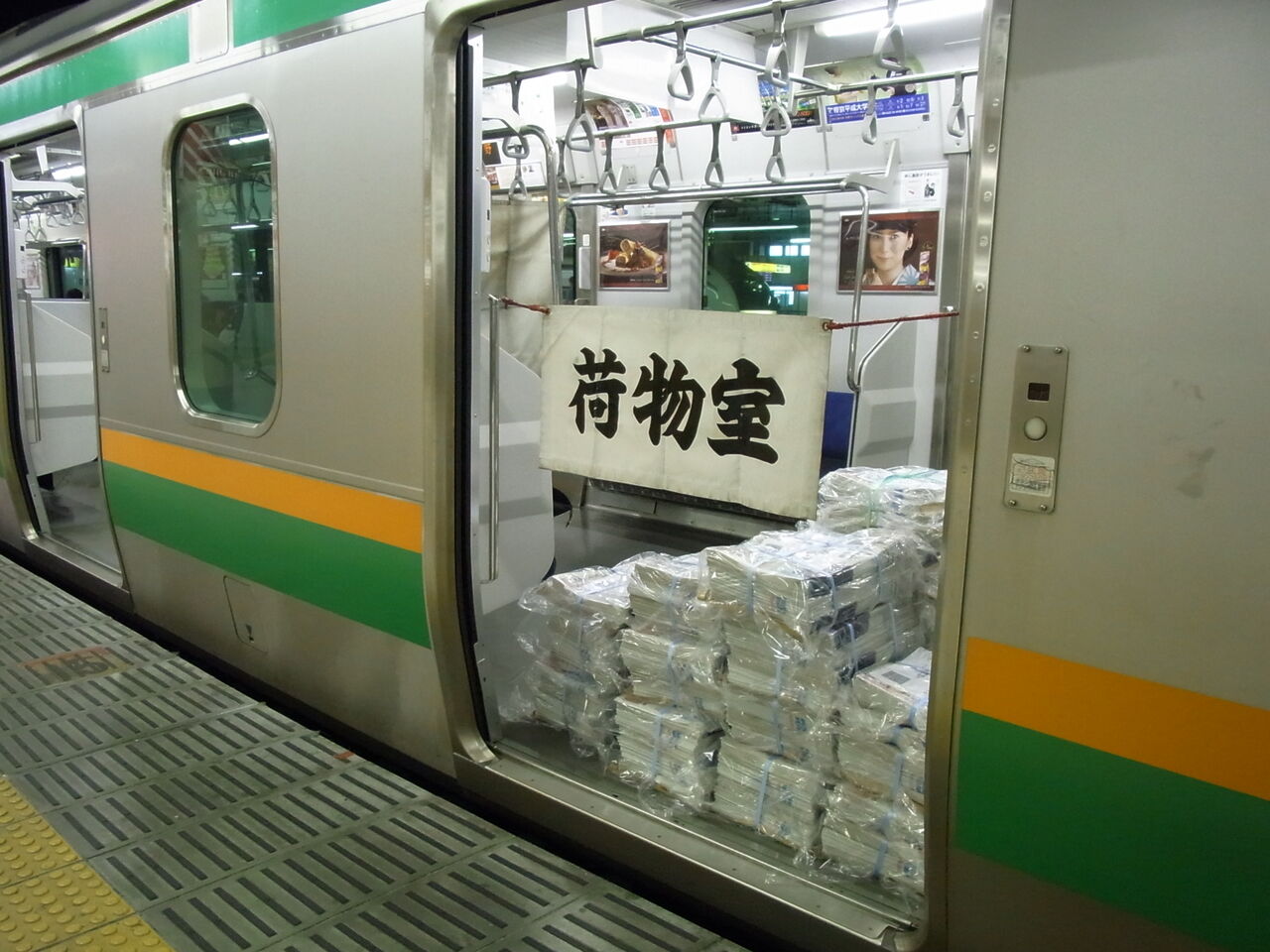 夕刊を山積みにし、上野寄り1号車の一部を仕切り荷物室としている。