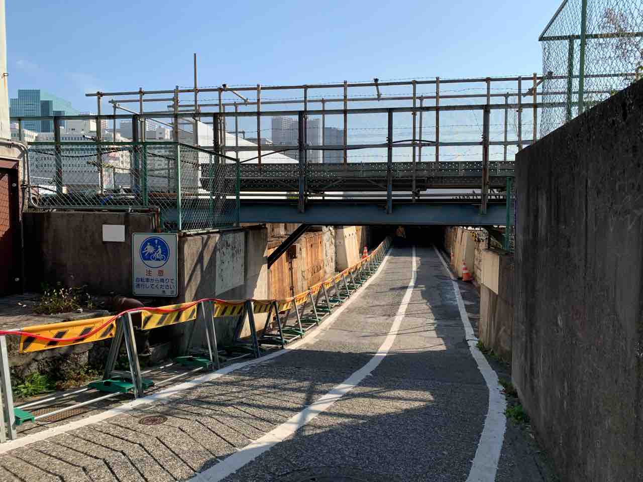 夜はオレンジ色のライトが灯って、刑事ドラマの襲われるシーンで良くあるような高架下に変わるらしい。が、工事の蛍光灯で今はそんなことはなさそう。
