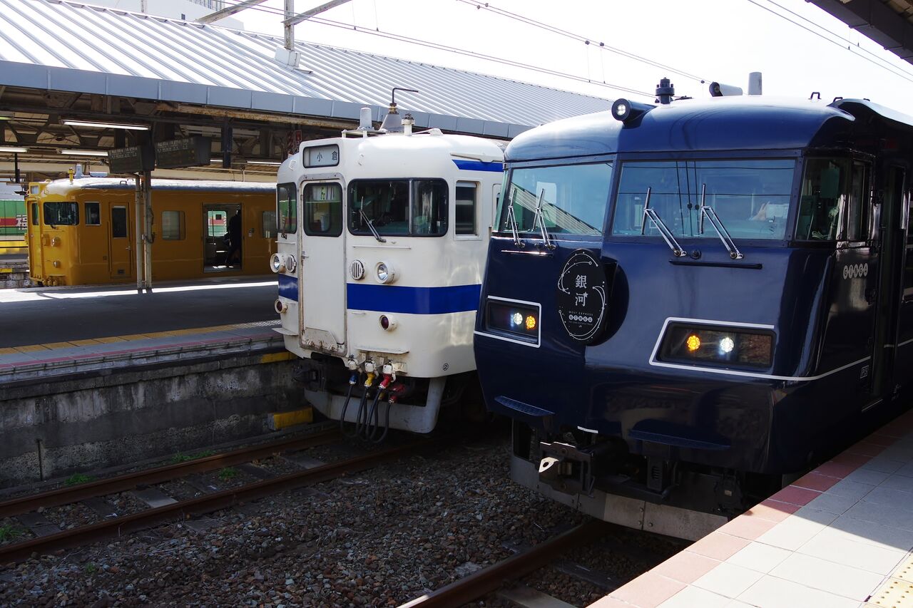We銀河はJR西日本完結なので、九州車と顔を並べるのは山陽コースならでは。ちょっと前まで下関地区には117系が来てたので、形式的には珍しくないのかもしれないけど。こういう並びもいつまで見られるでしょうか。