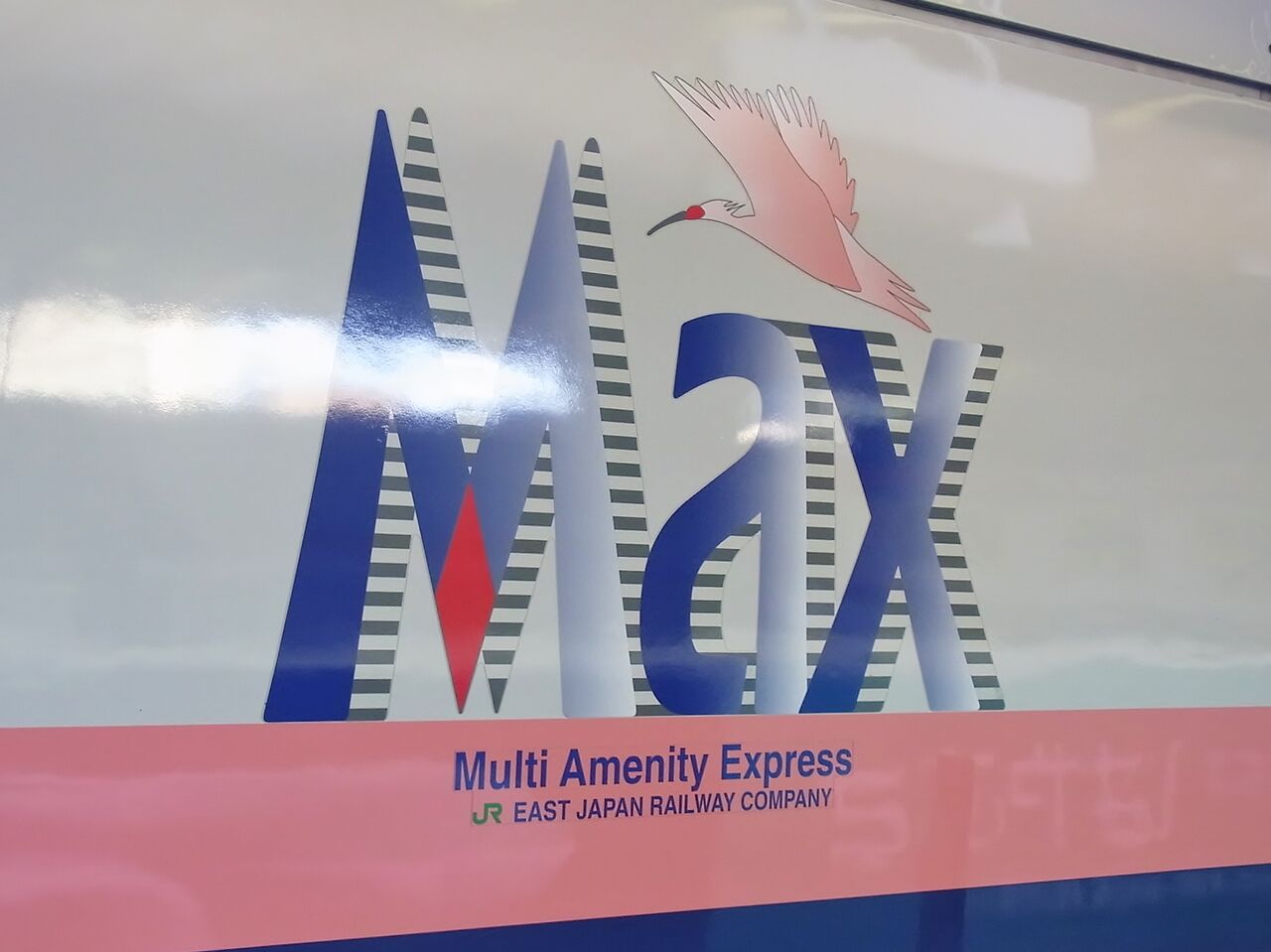新幹線Maxシリーズをブランドとして掲げようという勢いが感じられる大きなロゴマーク。E1系旧塗装でも同じく大きなMaxロゴだったが、朱鷺色変更後には右上に朱鷺が1羽飛ぶようになった。その後、朱鷺は増えて現行Maxでは3羽に増えたことに。