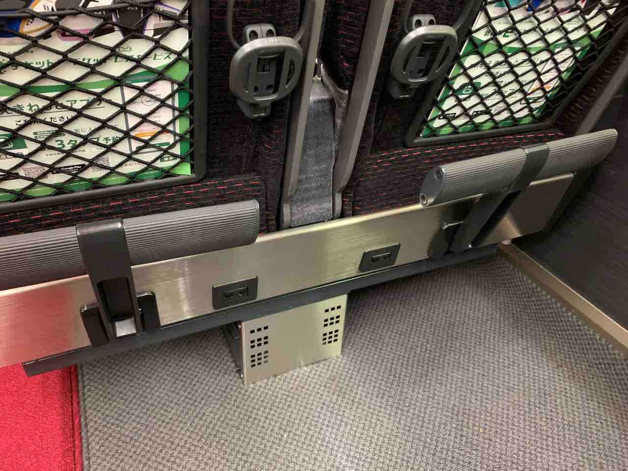 車いす席の隣の列の座席は、座面裏を使用できない関係で、腰元にコンセント、ひじ掛けにテーブルが用意されている。