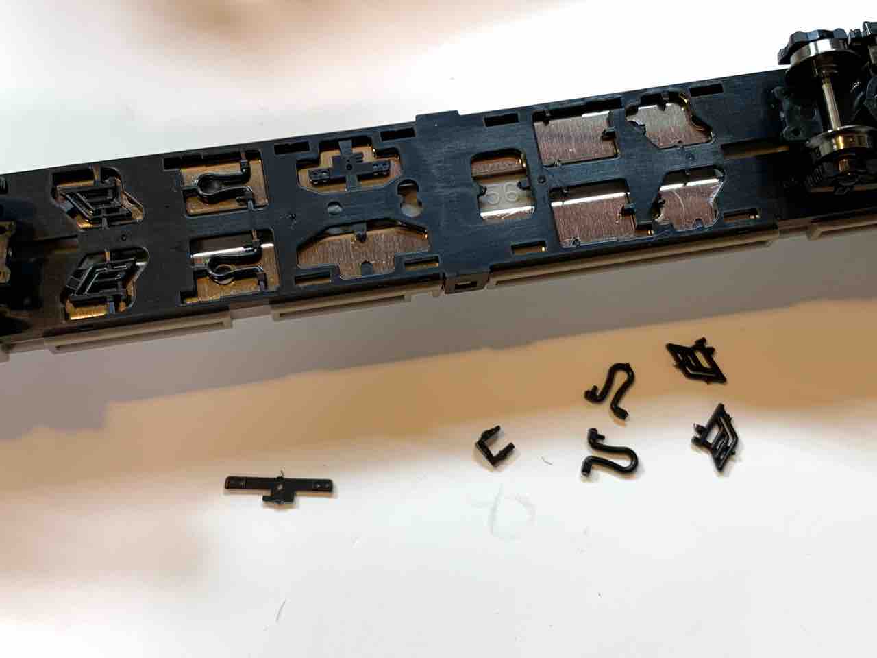 ここはちょっと難儀したところ。接着していないうえにパーツが細かいからとにかくよく外れる。これがあと7回あると思うとつらかった。初めはカプラー1つに3、40分かかってたところ、終わる頃には1つ5、10分で済むほど。とにかく慣れるしかない、としか言えない笑。