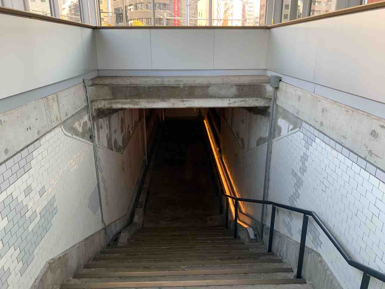 神田川と反対側のところに、ホーム跡地への入り口がある。入り口は3つで、1912階段と1935階段への入り口と、エレベーター。