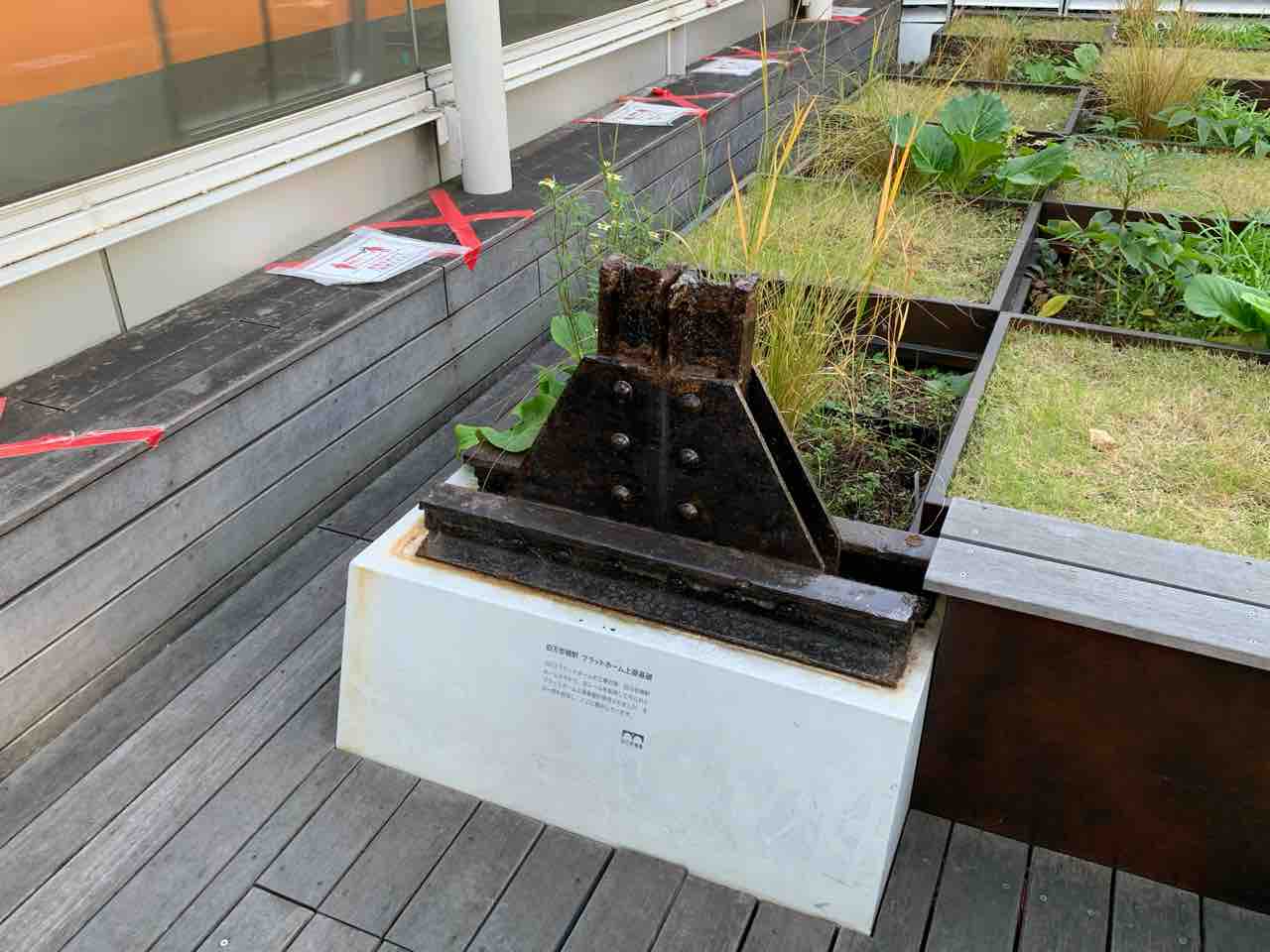 交通博物館の説明と、オブジェとしてレールが立てられている。
