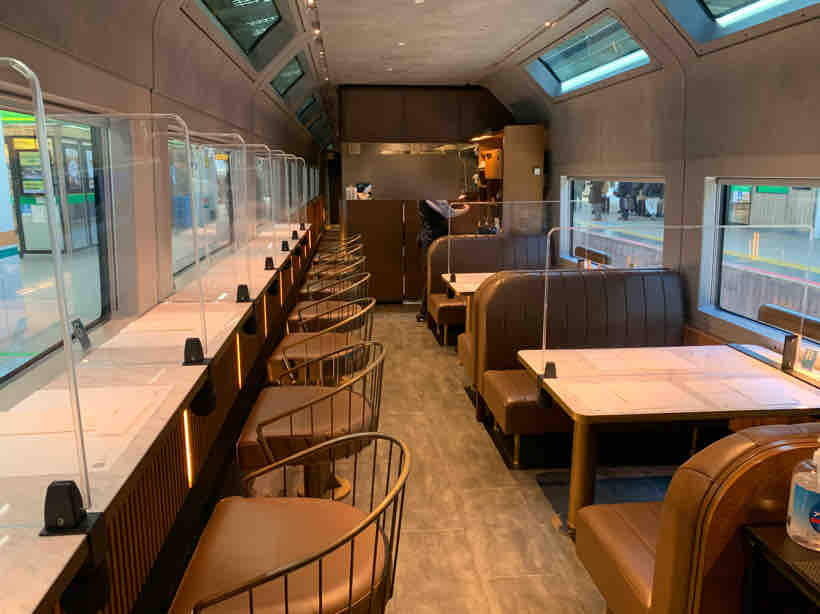 小窓たくさんの車内は、暖色系の照明にソファ風の座席、対面と窓側向きのカウンター席が備わっている。