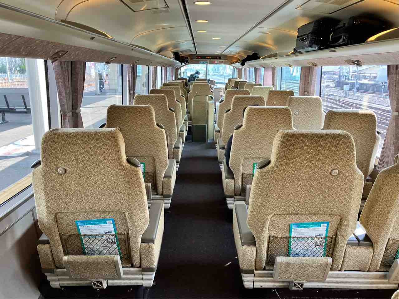 座席配置は2+1。車両中央部で配置が逆転しており、これは振り子式車両の特徴の1つだ。重量バランスを取る狙いがあり、JR北海道キハ281系などでも同じような配置が見られる。