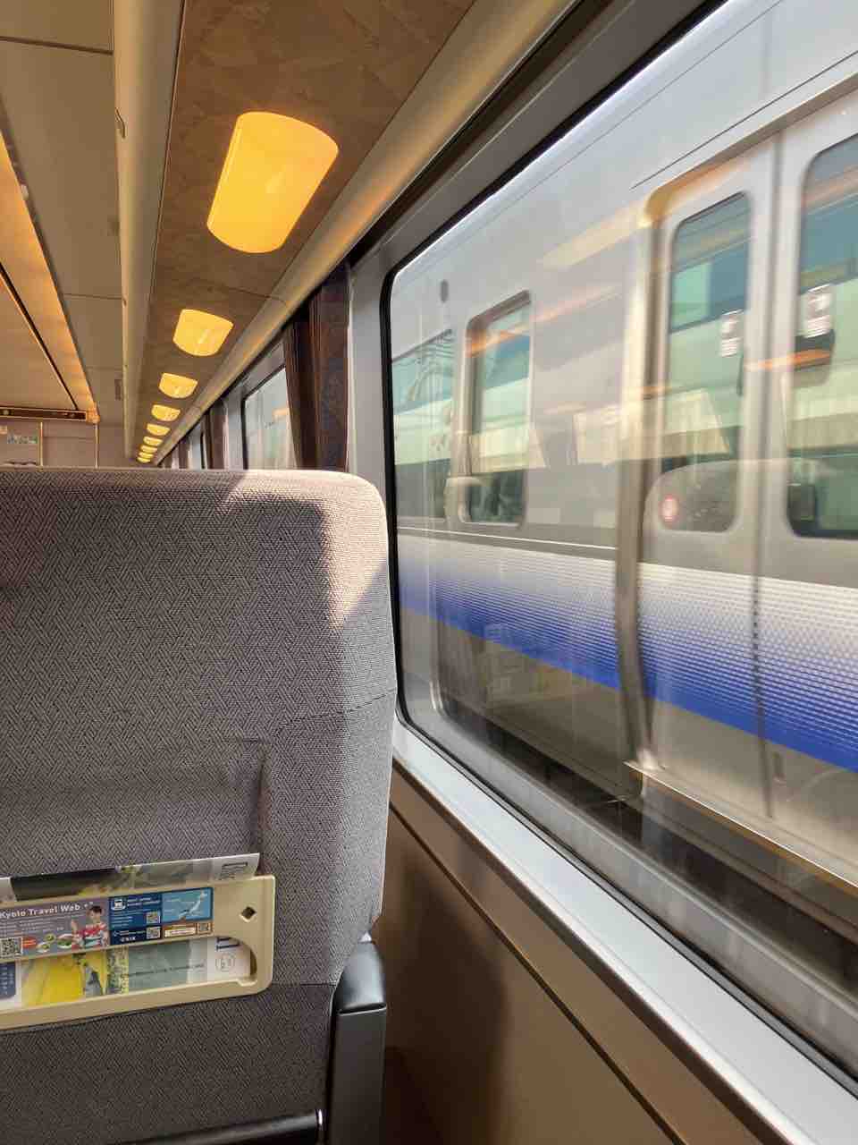 グリーン車は編成の端にあるため通り抜けをする客もおらず、静かで快適で本当に心地よかった。落ち着きある(インテリア)グリーン車はあるけど、気持ちを落ち着かせてくれるグリーン車って少ない気がする。最も長く乗車しても京都まで1時間半、短い乗車時間だけど存分にくつろいで貰おうという意匠が感じられる良い車両だった。